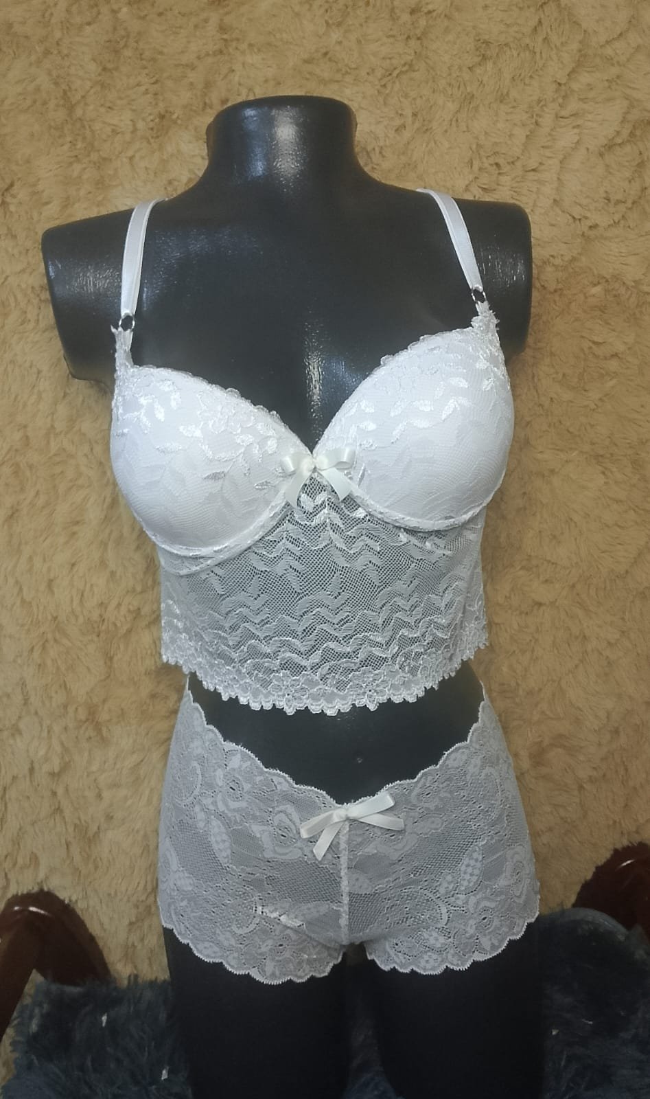 Define tu estilo con pureza y elegancia. Una combinación perfecta de comodidad, sofisticación y feminidad que transformará cualquier día en una experiencia especial. Con este bralette tipo corset y short de encaje, expresa tu personalidad mientras te deleitas con su diseño cuidado y atemporal.